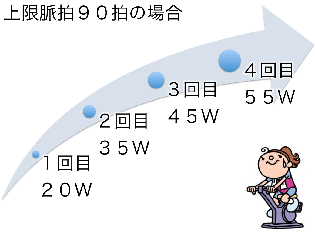 例えば、最初の運動では心拍数の上限を90拍までとした場合、20W(ワット)までしかできませんでした。次に2回目の運動では心拍数の上限を同じ90拍までとして行ったところ、今度は35Wまで運動することができました。そして、3回目では45W、4回目では55Wと向上しました。